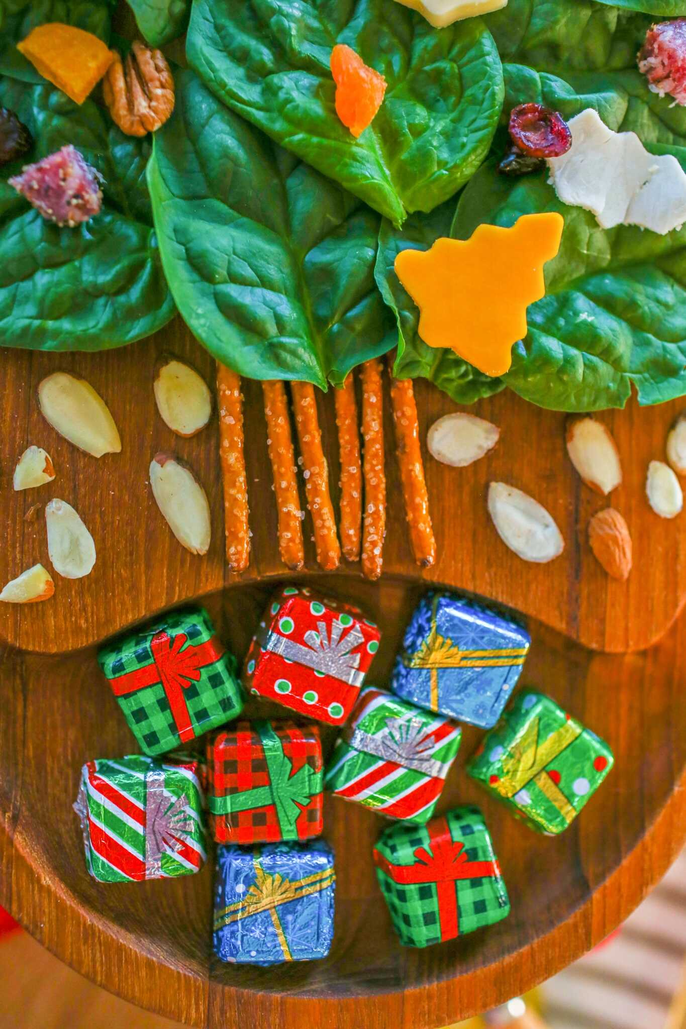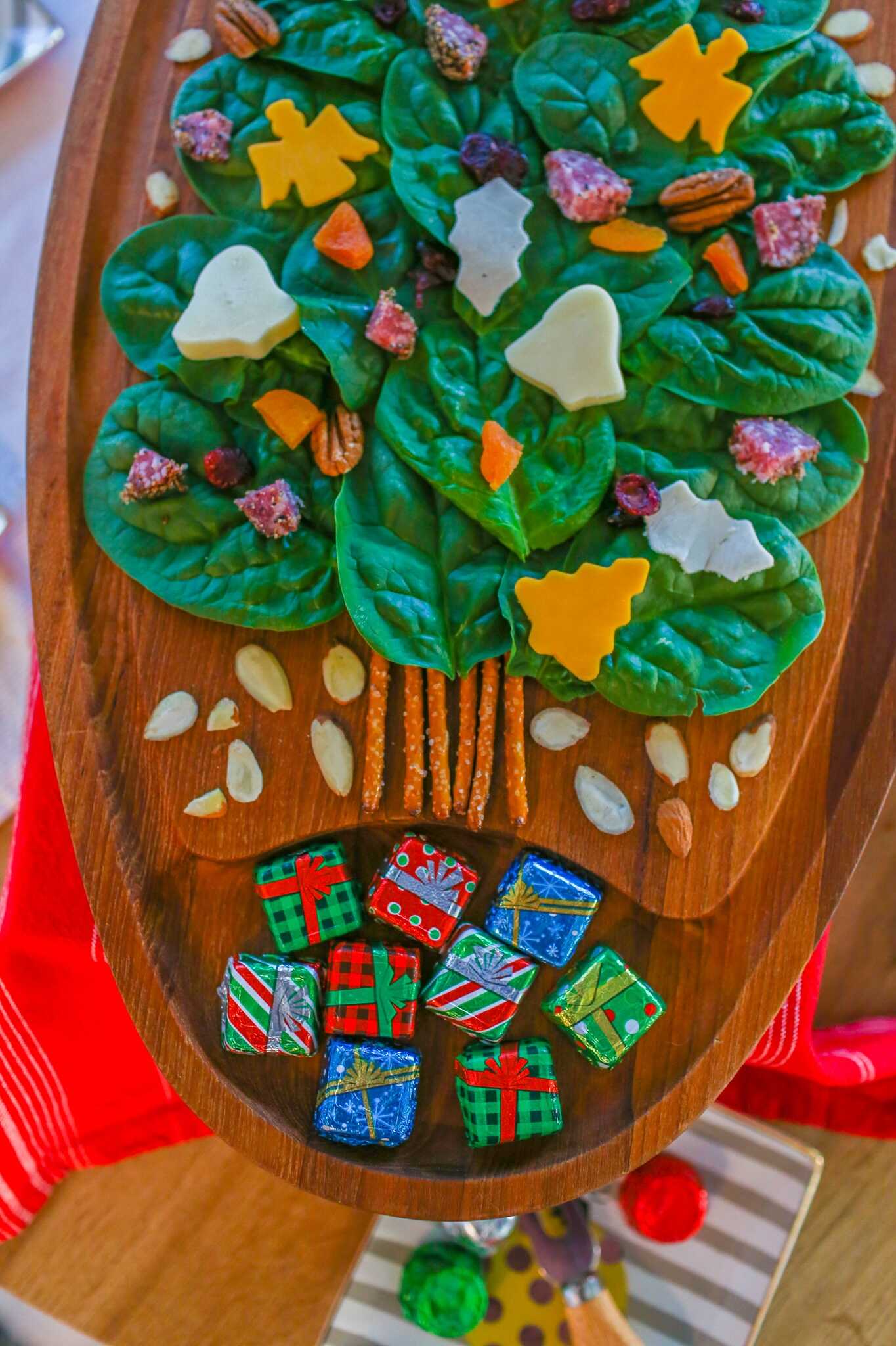 This version is extra fun because instead of a traditional meat-and-cheese platter, it uses fresh spinach leaves arranged in the shape of a Christmas tree, decorated with colorful cheese cutouts, dried fruit, nuts, and savory bites. Pretzel sticks make the perfect trunk, while wrapped chocolates serve as little “presents” under the tree. The result is a healthy yet indulgent grazing board that both kids and adults will love.