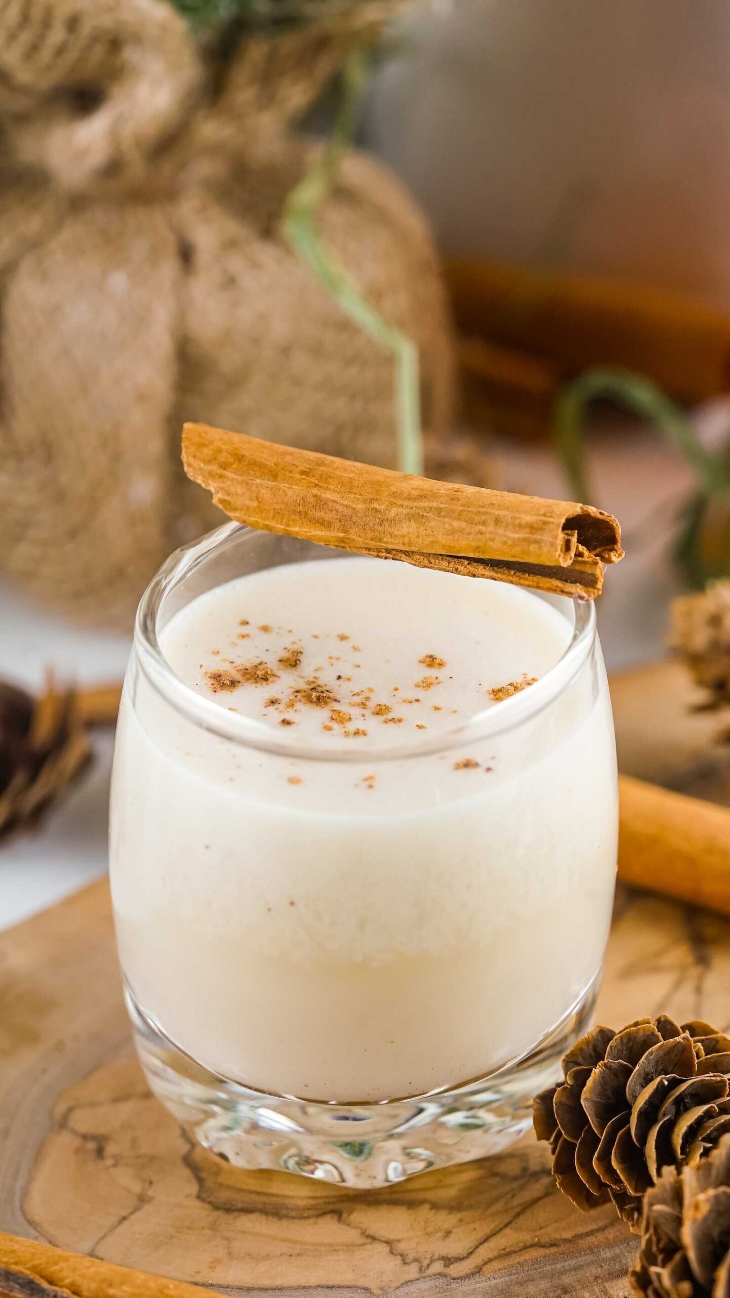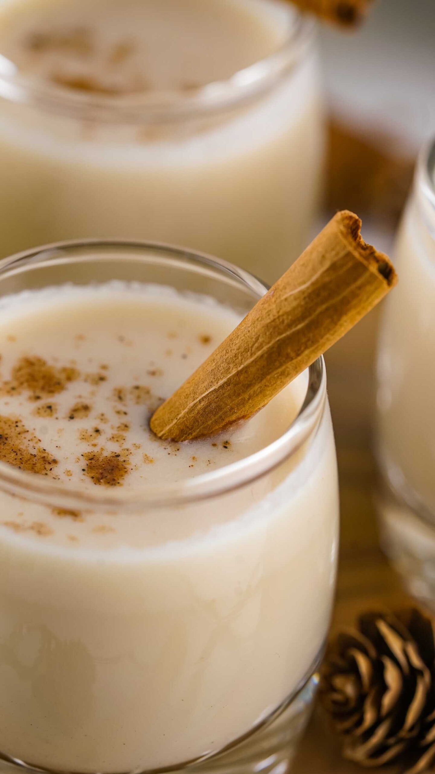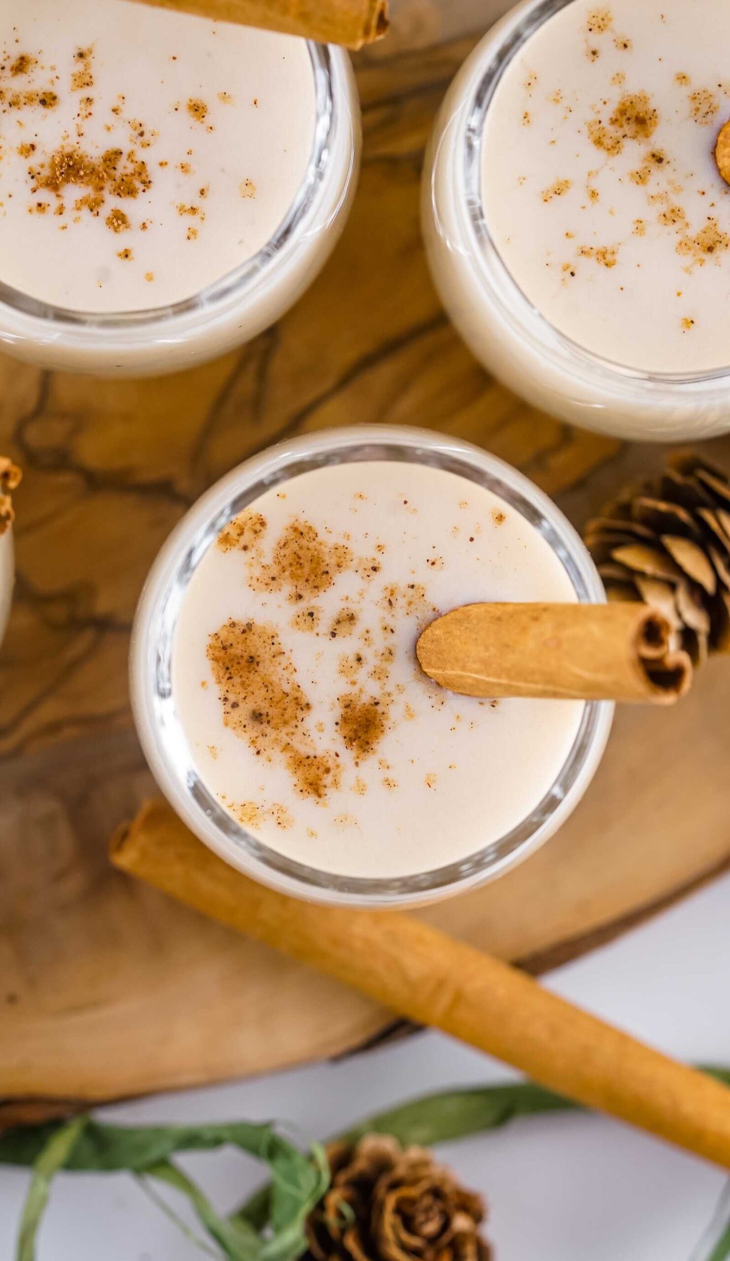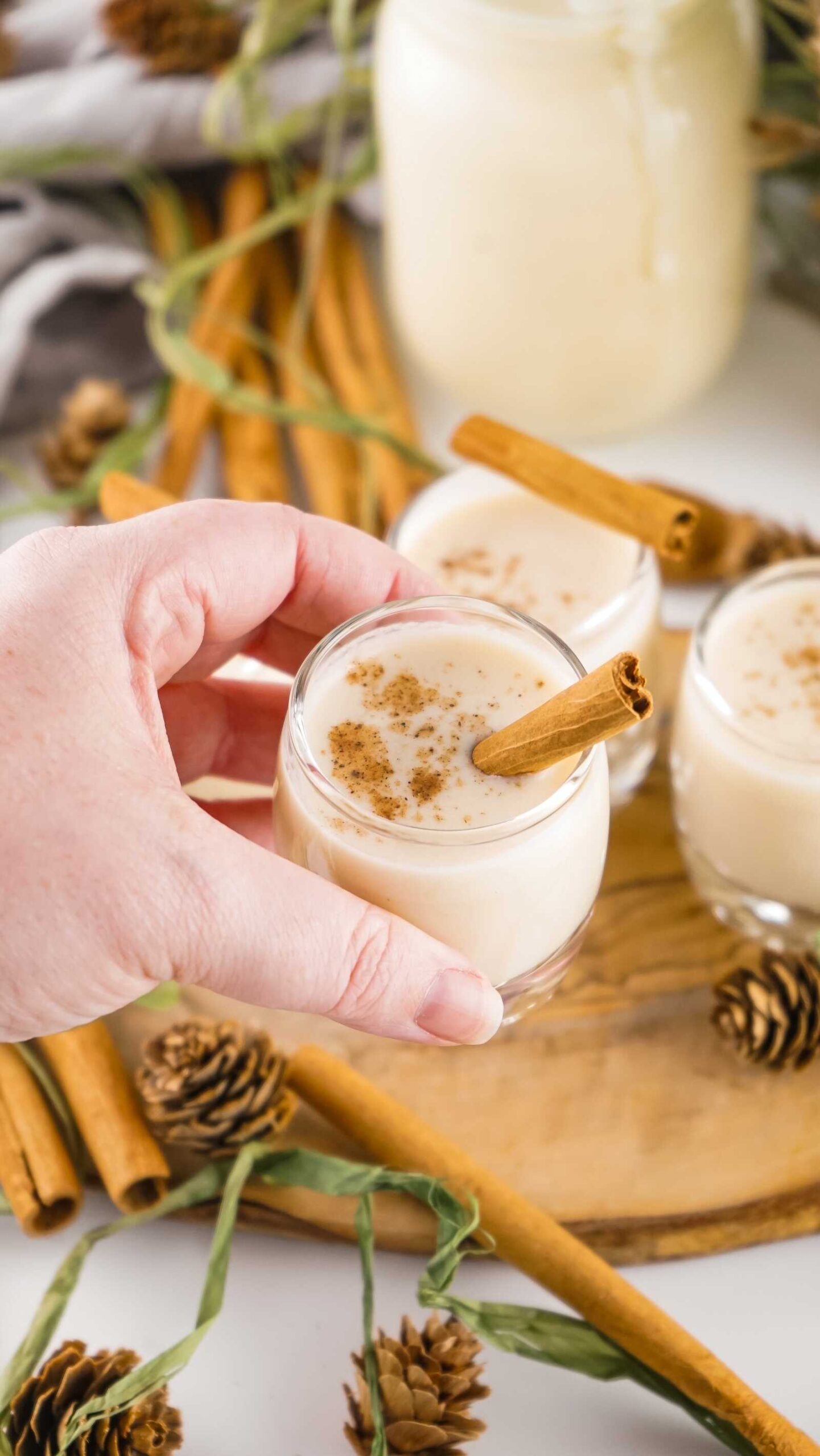 A cinnamon stick and sprinkle of ground nutmeg elevate the whole presentation. In seconds, your tiny shot glass turns into a mini Christmas moment.