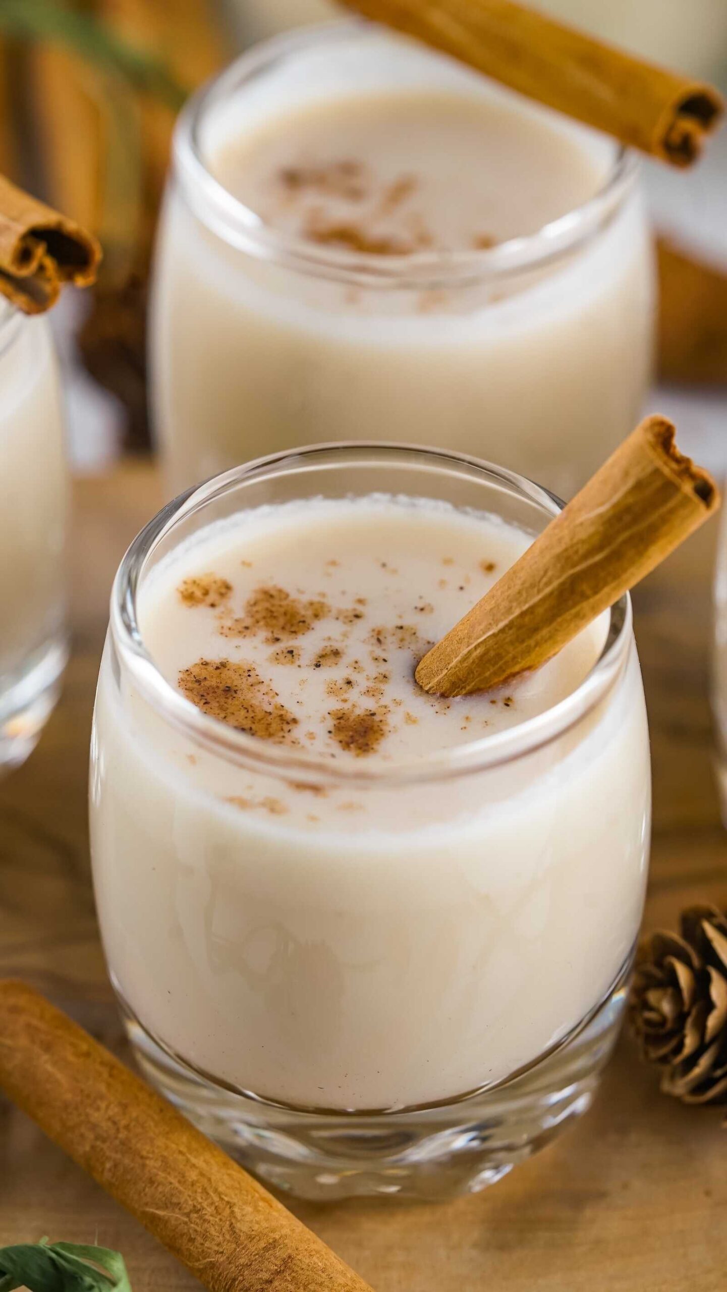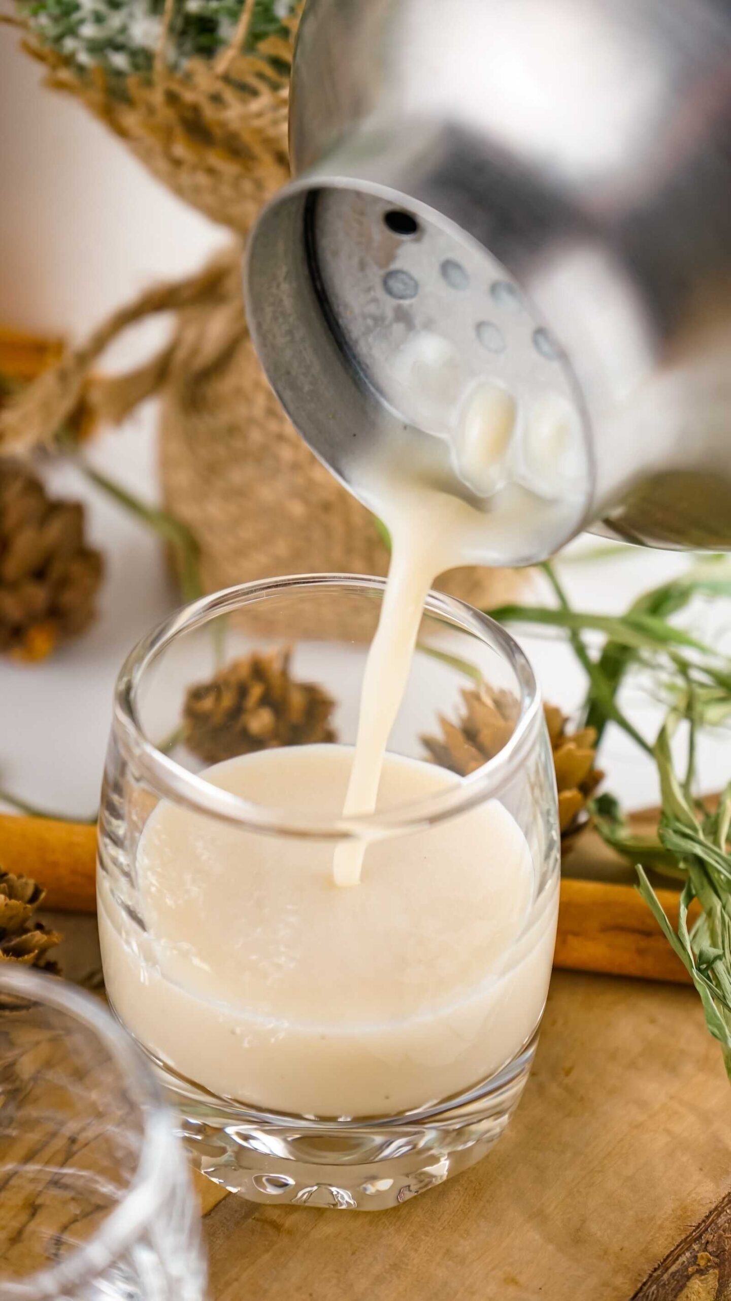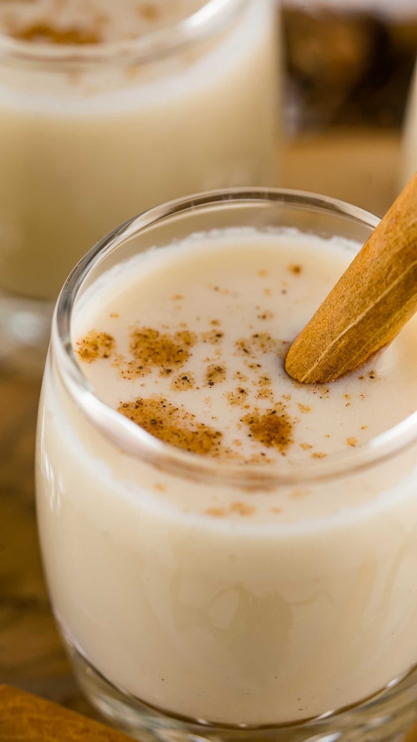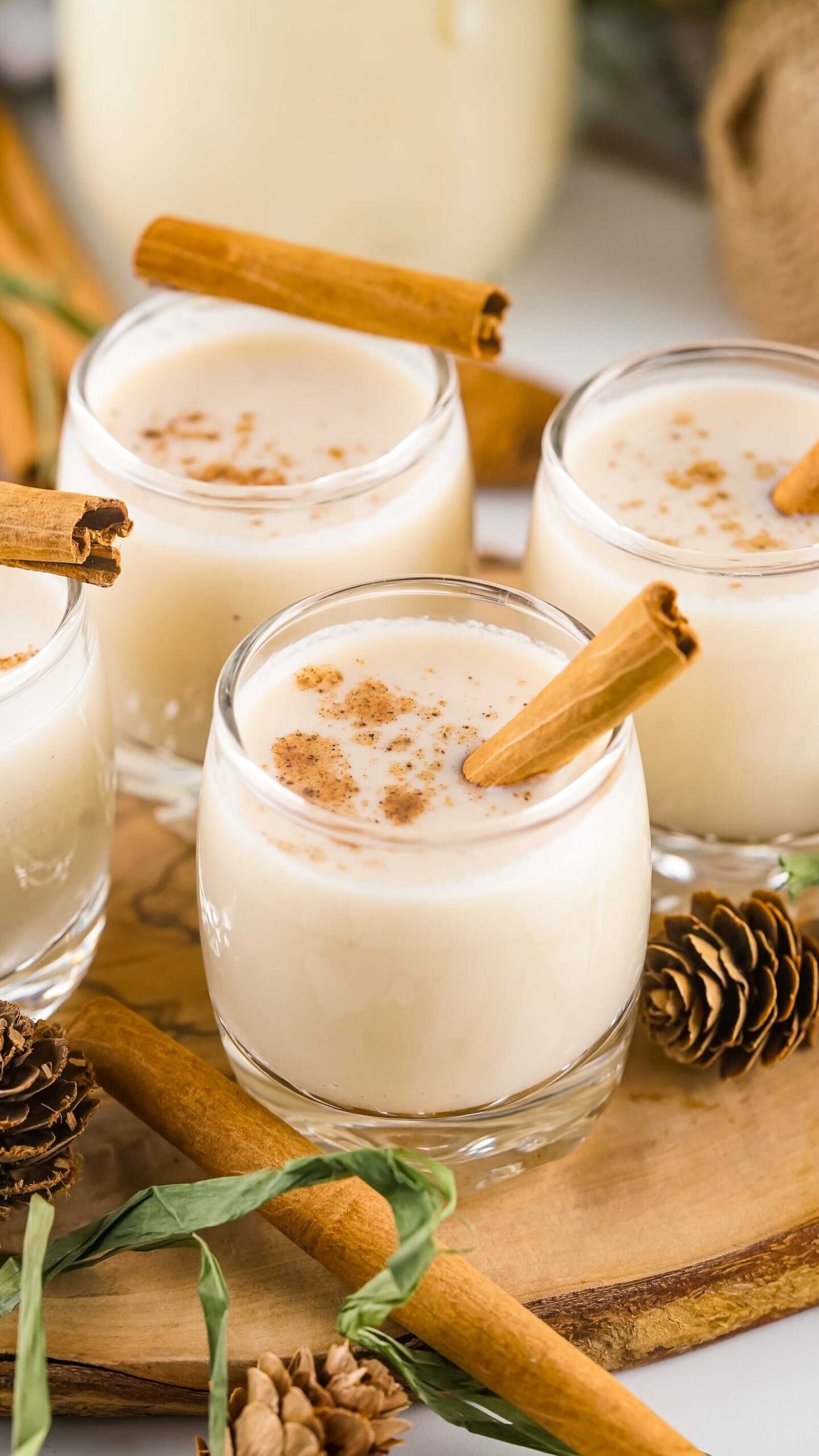A cinnamon stick and sprinkle of ground nutmeg elevate the whole presentation. In seconds, your tiny shot glass turns into a mini Christmas moment.