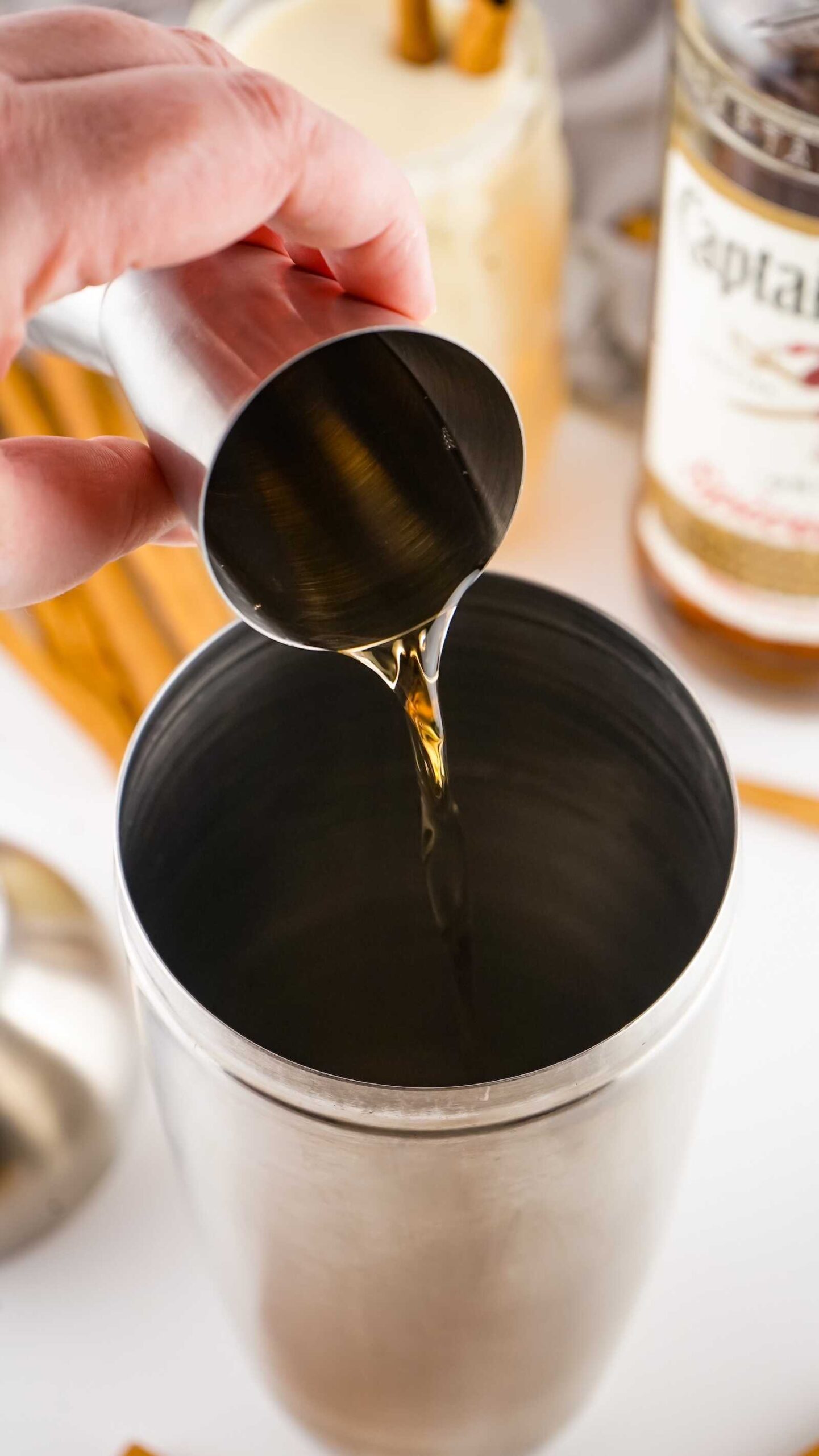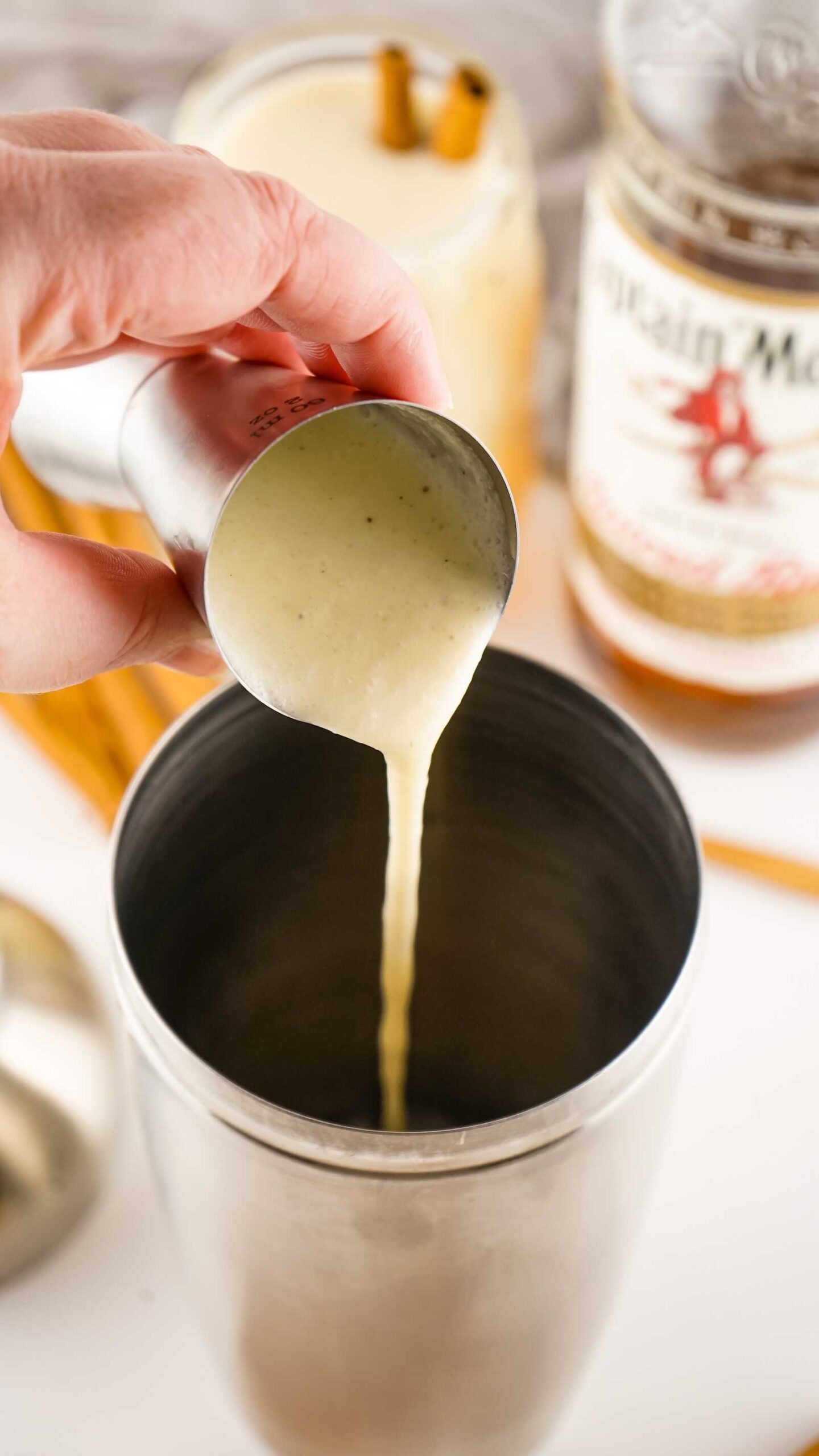 - Add 1¼ ounces eggnog