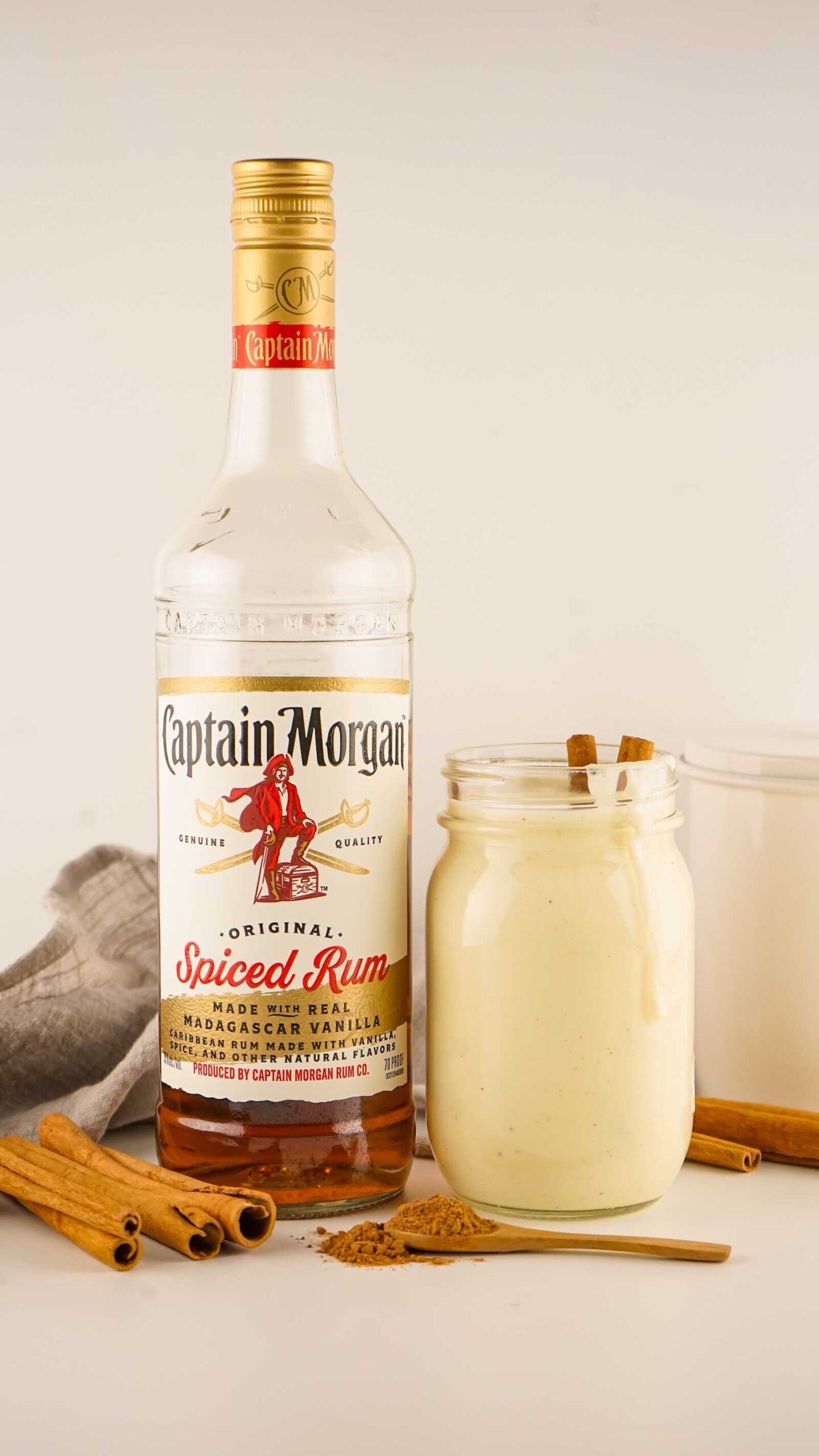 Eggnog brings that signature creamy, sweet, nutmeg-touched base. Spiced rum adds warmth, holiday spice, and a bold kick that balances the richness perfectly.