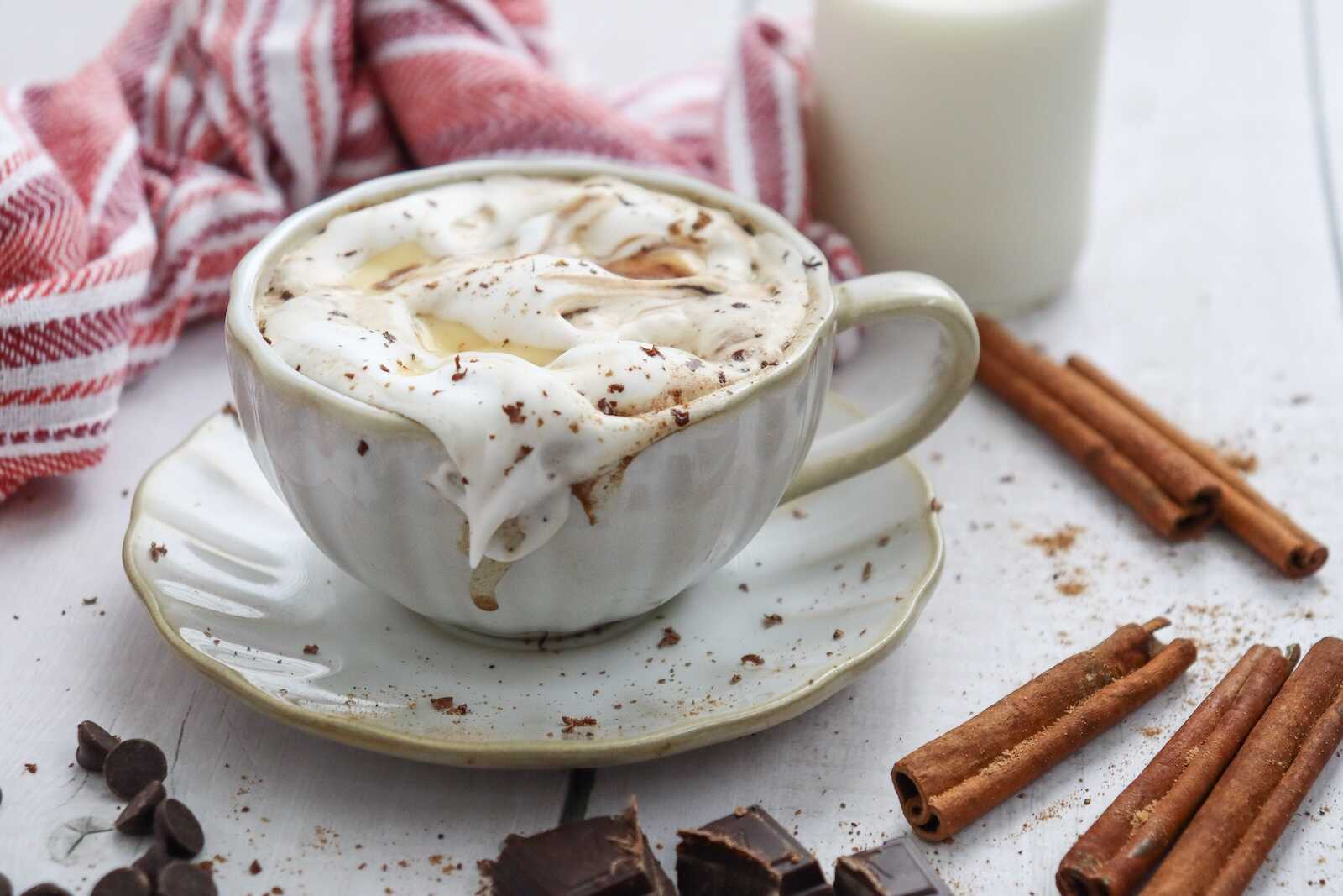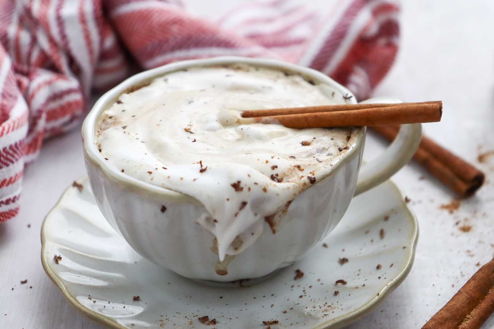 A mug of eggnog hot chocolate is a comforting start to a family gift-opening session.