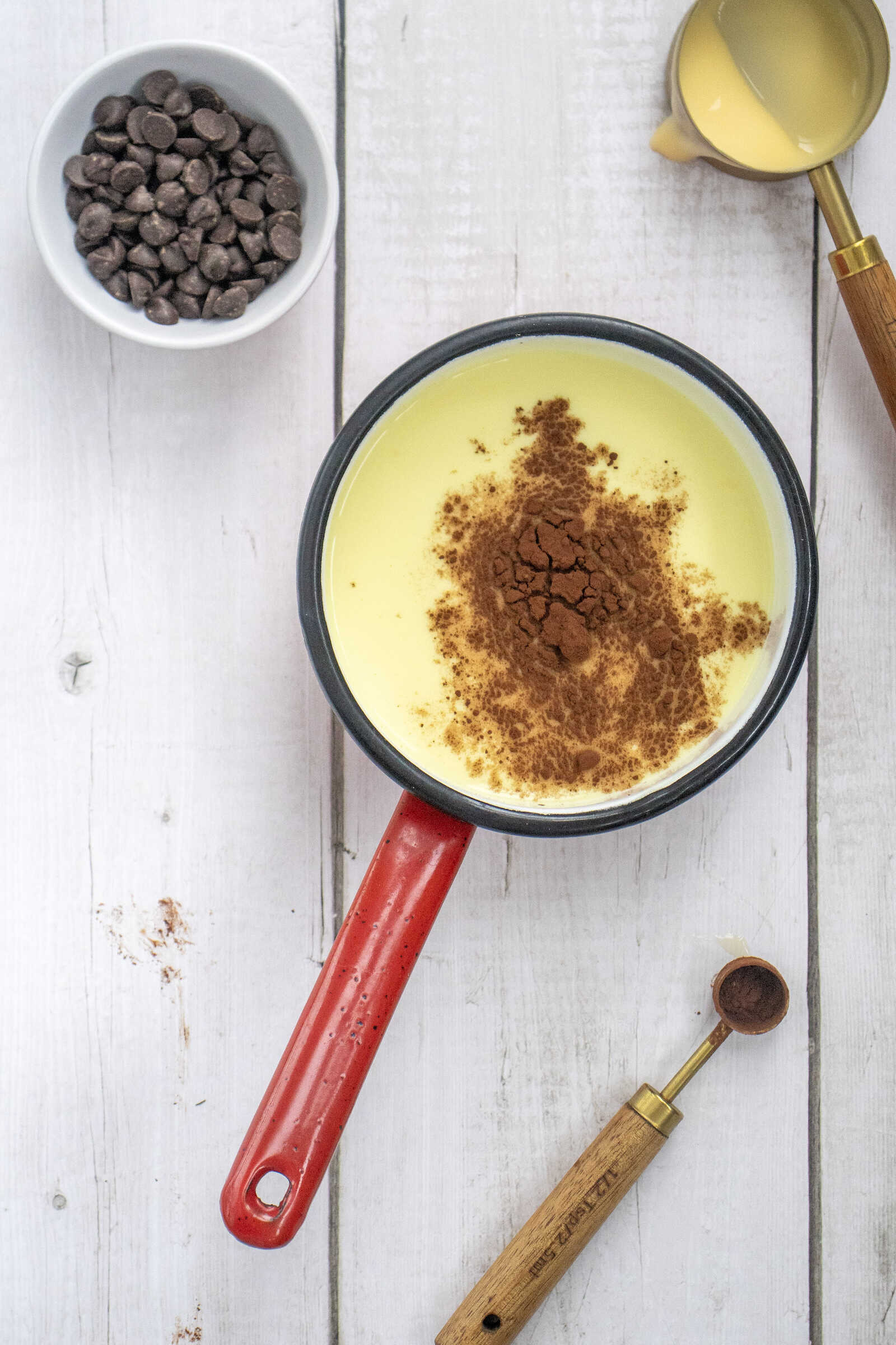 Stir in the chocolate chips and cocoa powder (if using), whisking until the chocolate fully melts and the mixture becomes silky smooth.