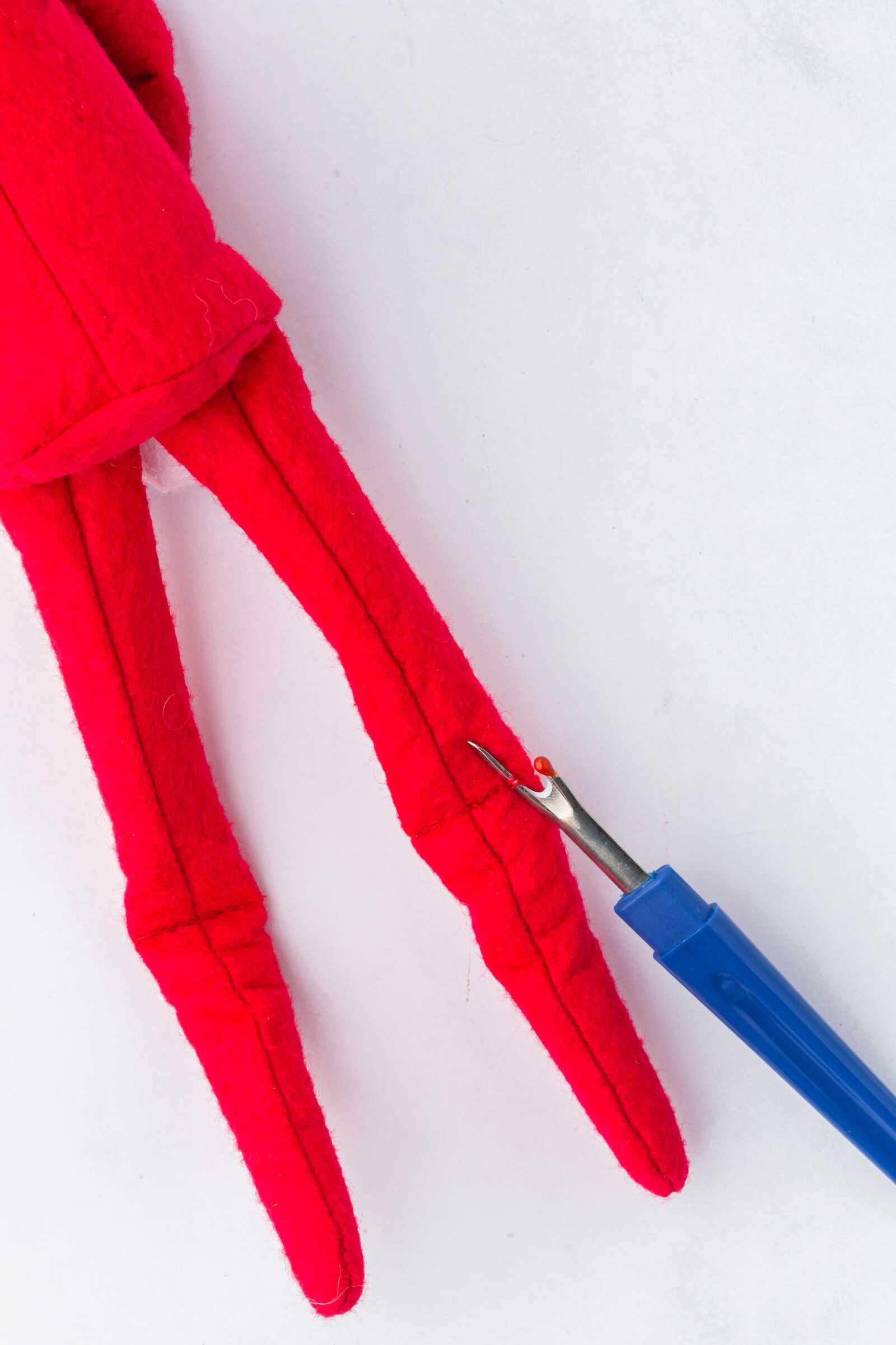 Take your time with the hands and feet, since these areas are smaller. If your elf’s hands are sewn together, remove the connecting stitch to separate them.
