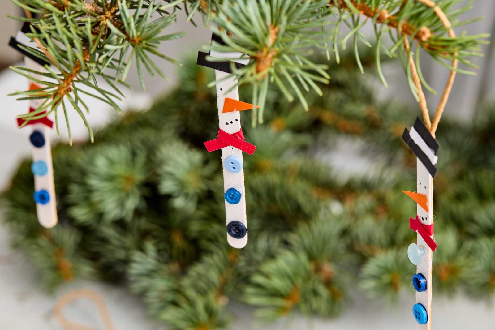 Create a “family” of ornaments — a larger stick for an adult snowman and smaller sticks for child snowmen. Hang them together as a family cluster.